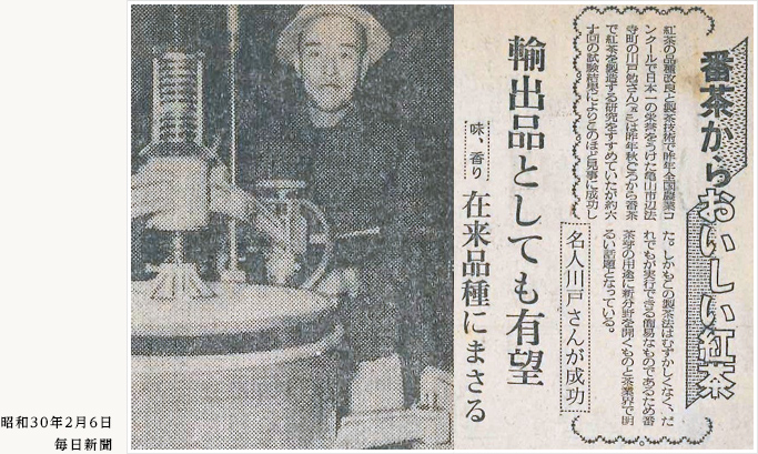 川戸氏は自ら優良紅茶品種の研究に取り組み、三重県茶業分場で「国茶C8」の優秀さを知ります。こうして昭和24年に県と共に「国茶C8」の増殖に取り組み、昭和26年に第5回全国茶品評会の紅茶の部に全国で初めて「国茶C8」を出品し8位となりました。