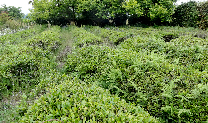 かつては最大約50haの面積を誇った「べにほまれ」茶園も緑茶用品種への改植が進み、40年以上経た現在、市内の生産者の記憶からもほとんど消え去っていました。そのなかで、駒田氏の記憶を手掛かりに市内茶園の調査を行い、安坂山町、布気町に50年を超える古木の「べにほまれ茶園」約30aが残されていることを発見しました。しかし、「やぶきた」を中心とした緑茶生産がおこなわれている中で、「べにほまれ」は活用されることはなく、枝は伸び放題、雑草に埋もれた状態でした。Kisekiの会では「べにほまれ」紅茶の再生産に向け、奇跡的に残された「べにほまれ」園の再生を行っています。